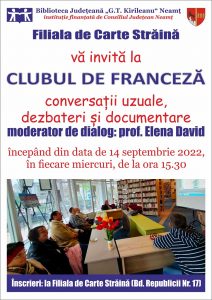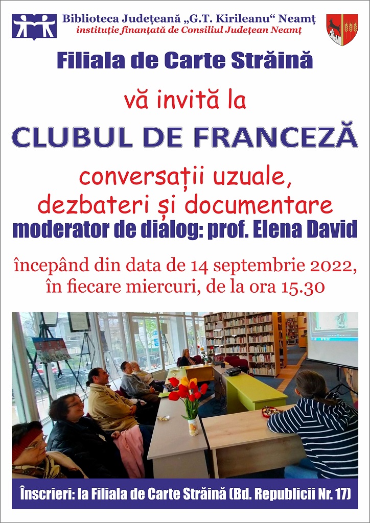 Biblioteca Județeană „G. T. Kirileanu“ Neamț îi invită pe toți cei interesați să participe la o nouă serie de întâlniri ale Clubului de franceză, moderate de profesor Elena David.