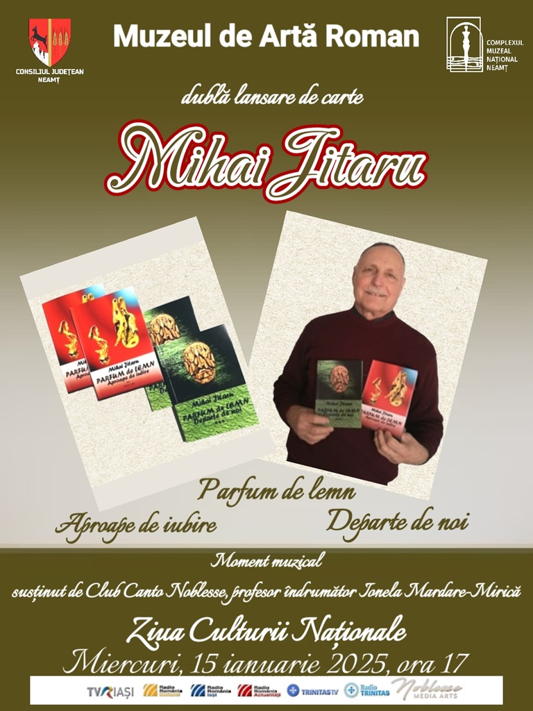 Miercuri, 15 ianuarie 2025, vă invităm la Muzeul de Artă din Roman, pentru a sărbători Ziua Culturii Naționale, prin poezie și artă. Începând din anul 2011, data de 15 ianuarie, ziua de naștere a poetului național Mihai Eminescu, a devenit Ziua Culturii Naționale. Evenimentul va fi marcat printr-o dublă lansare de carte, două volume de poezii, din seria ”Parfum de lemn”, semnate de romașcanul Mihai Jitaru, dascăl, poet, sculptor, grafician. Este vorba despre volumele 2 și 3: ”Aproape de iubire” și ”Departe de noi”, care vin în completarea volumului 1: ”Aproape de Dumnezeu”, lansat în anul 2023 la Muzeul de Artă din Roman. Toate cele 3 volume sunt apărute la editura PIM din Iași, în anii 2023 și 2024, într-o grafică realizată de autor și bucurându-se de prefațări susținute de profesori și artiști vizuali: profesor Nelu Dumbravă, profesor Maria Gavrilă, artist plastic Irina Lazăr, doctor Elena Ionel. O îmbinare armonioasă între idei dăltuite în lemn, în penel și în condeiul scrierilor rimate. Ca o completarea firească, prezentarea celor două volume va fi însoțită și de expunerea unor lucrări de sculptură care întregesc demersul poetic.