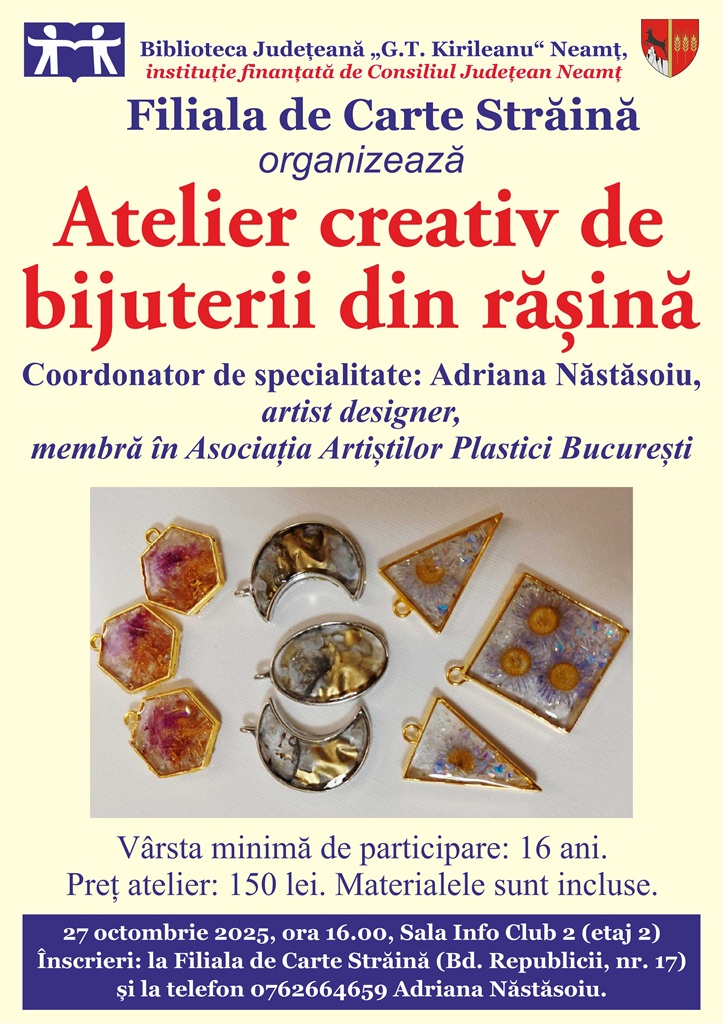 Biblioteca Județeană „G.T. Kirileanu“ Neamț organizează luni, 27 octombrie 2025, un atelier creativ de bijuterii din rășină UV, sub îndrumarea de specialitate a artistei designer Adriana Năstăsoiu, membră în Asociația Artiștilor Plastici din București.