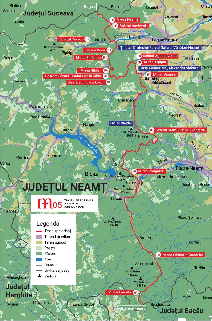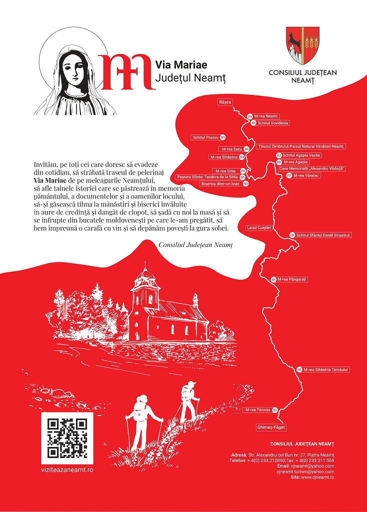 Traseul Via Mariae, care traversează Austria, Ungaria, Slovacia, Polonia, Croația, Bosnia și Herțegovina și România, se întinde în județul Neamț pe 132 km, conectând 15 așezăminte monahale, inclusiv Mănăstirea Neamț.