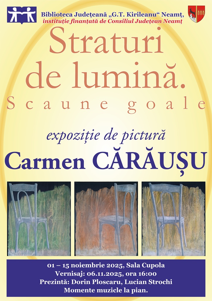 Biblioteca Județeană „G.T. Kirileanu“ Neamț găzduiește expoziția de pictură „Straturi de lumină. Scaune goale“ semnată de artista Carmen Cărăușu, în perioada 1-15 noiembrie 2025, în Sala Cupola.