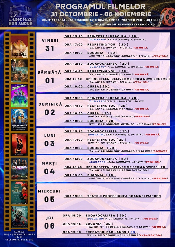 Programul Cinema Mon Amour Piatra Neamț în perioada 31 octombrie – 6 noimebrie 2025