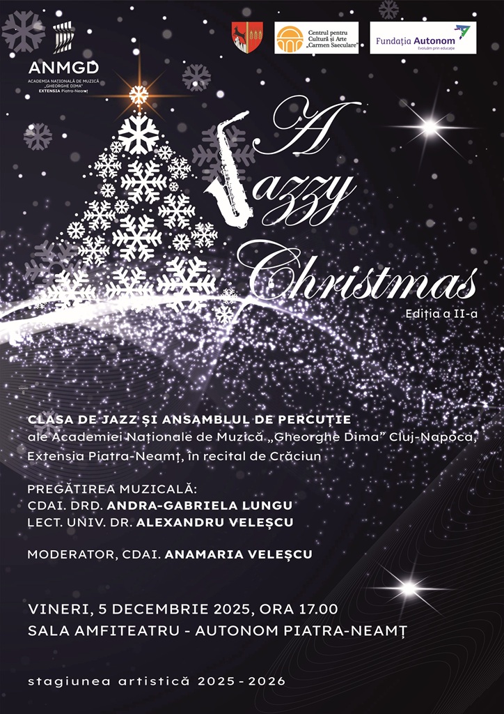 A Jazzy Christmas” este propunerea muzicală pentru vineri5 decembrie 2025 (ora 17:00), la sala amfiteatru de la Autonom, protagoniști fiind studenții Clasei de jazz și membrii Ansamblului de percuție ale Academiei Naționale de Muzică „Gheorghe Dima” Cluj-Napoca, Extensia Piatra-Neamț.