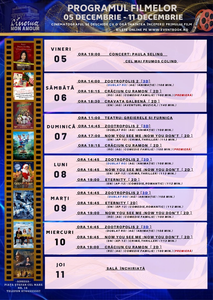 Programul Cinema Mon Amour Piatra Neamț în perioada 5-11 decembrie 2025