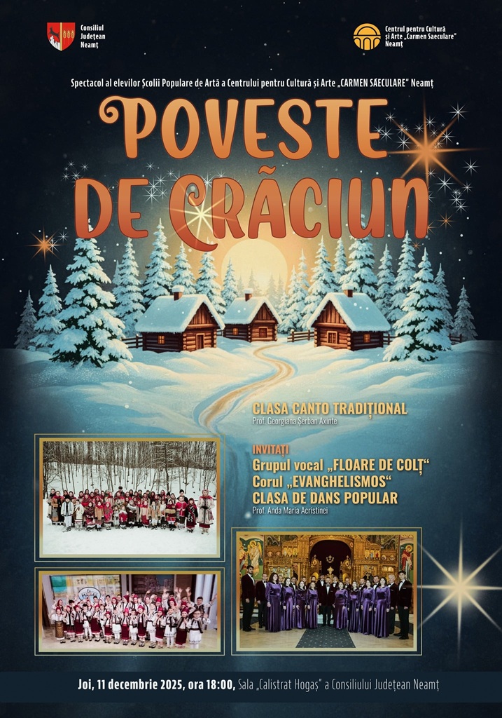 Spectacolul va avea loc joi, 11 decembrie 2025, ora 18:00, la sala „Calistrat Hogașˮ a Consiliului Județean Neamț.