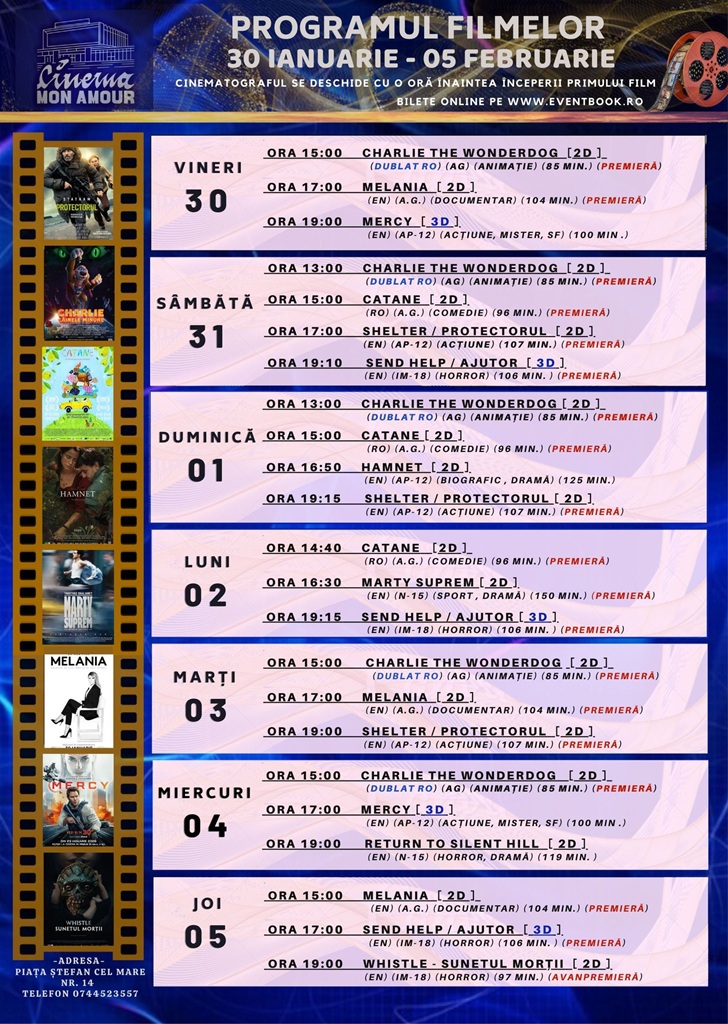 Programul Cinema Mon Amour Piatra Neamț în perioada 30 ianuarie – 5 februarie 2026
