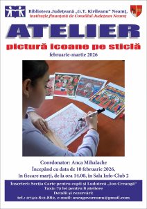 Biblioteca Județeană „G.T. Kirileanu“ Neamț organizează, în perioada februarie-martie 2026, un nou atelier de pictură pe sticlă dedicat copiilor și coordonat de Anca Mihalache, bibliotecar la Secția Carte pentru copii și Ludotecă „Ion Creangă“. Sunt disponibile 15 locuri.