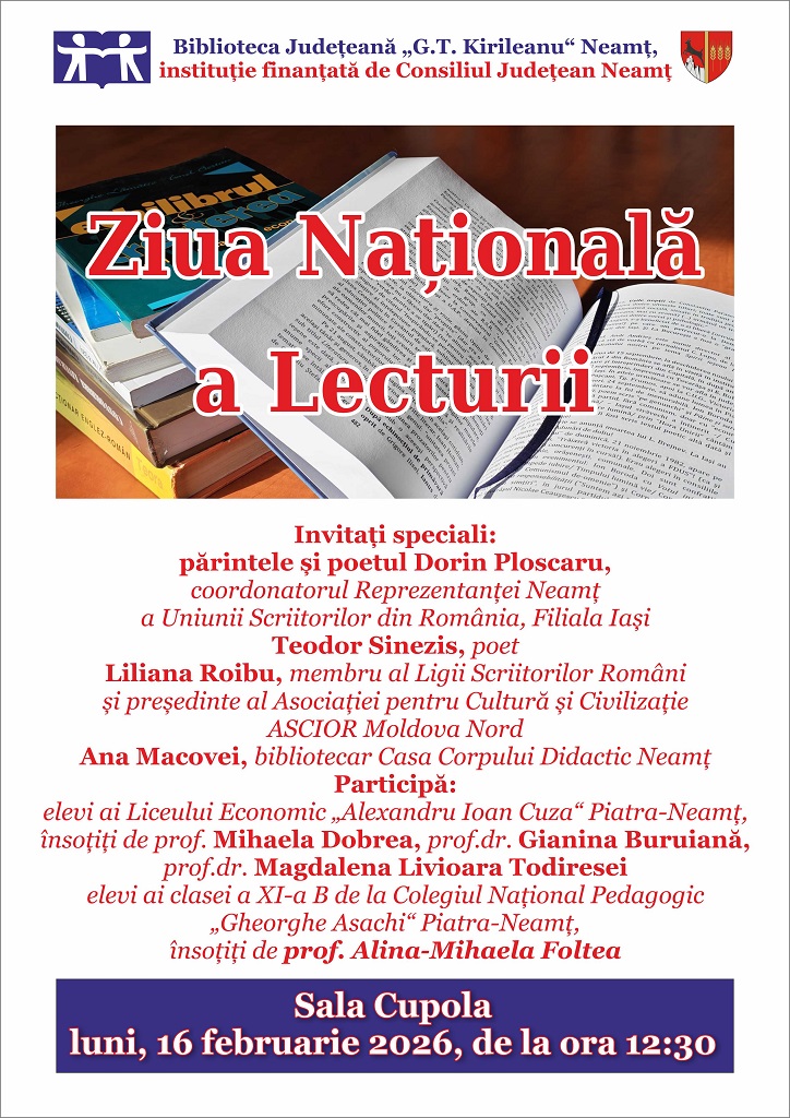 Biblioteca Județeană „G.T. Kirileanu“ Neamț organizează manifestări dedicate Zilei Naționale a Lecturii, luni, 16 februarie 2026.