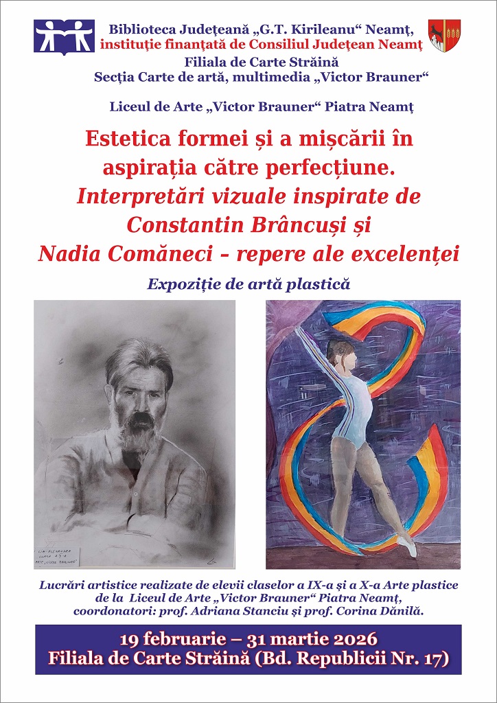 Biblioteca Județeană „G.T. Kirileanu“ Neamț organizează expoziția de artă plastică „Estetica formei și a mișcării în aspirația către perfecțiune. Interpretări vizuale inspirate de Constantin Brâncuși și Nadia Comăneci – repere ale excelenței“, la Filiala de Carte Străină, în perioada 19 februarie – 31 martie 2026.