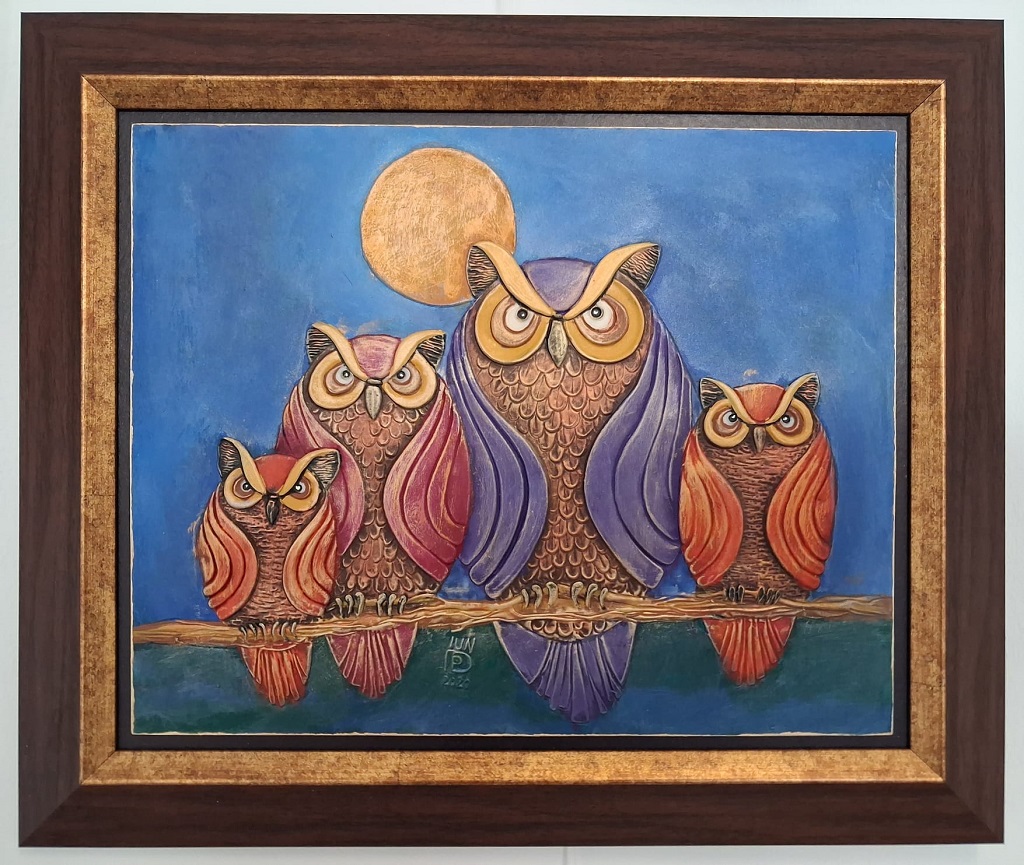 Expoziția cuprinde un număr de 52 lucrări de pictură realizate în tehnica acrilic pe pânză și 30 reliefuri lucrate în metaloplastie și rășină, în care se regăsesc binecunoscutele elemente și simboluri folosite de către artist în creațiile sale: bufnița, mărul, cactușii, anotimpurile, femeia, fluturii,, păsările, natura, etc.