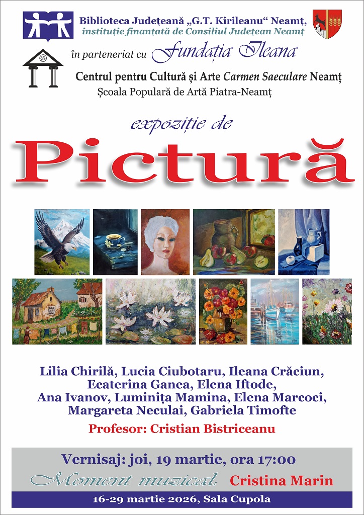 Biblioteca Județeană „G.T. Kirileanu“ Neamț, în parteneriat cu Fundația Ileana și cu Școala Populară de Artă din cadrul Centrului pentru Cultură și Arte „Carmen Saeculare“ Neamț, organizează ediția de primăvară a expoziției colective de pictură pe simezele Sălii Cupola, în perioada 16-29 martie 2026.