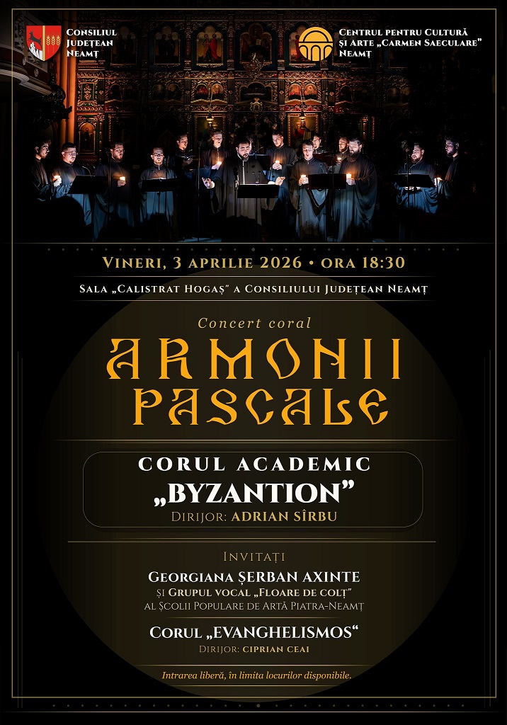 În preajma Sărbătorii Floriilor, Centrul pentru Cultură și Arte „Carmen Saeculare” Neamț invită publicul să participe la evenimentul special prilejuit de concertul Corului Academic „BYZANTION”, ansamblu aflat sub conducerea muzicală și artistică a dirijorului Adrian Sîrbu. Invitați să evolueze în cadrul aceluiași eveniment sunt Georgiana Șerban AxinteGrupul vocal „Floare de colț” al Școlii Populare de Artă Piatra-Neamț și Corul „Evanghelismos”, dirijat de Ciprian Ceai.